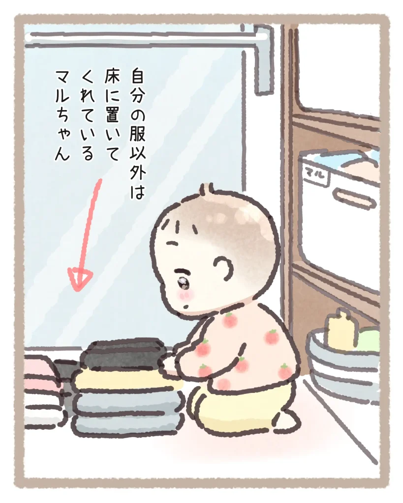 テッテッテッと小走りで洋服棚に向かうマルちゃんの後ろ姿、たまらなく愛おしいです。「あぁ…きっとまた」と察するお母さんの表情が絶妙で、これまでにも色々あったんだろうなと想像してしまいました。子どもの「お手伝い」って、結果的に親の作業が増えることがほとんどなんですよね。でもその過程こそが子どもの自立心や達成感を育てる大切な時間なんだと、育児書でもよく言われています。