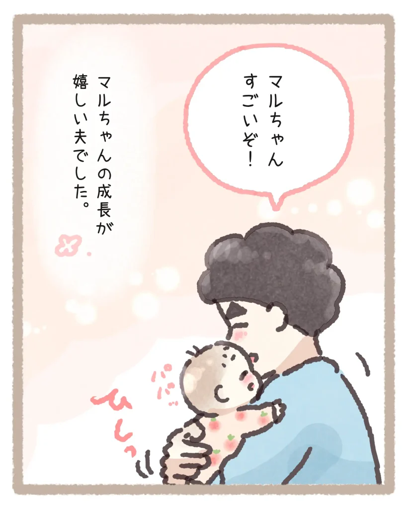 それでも「パパパ、はこんでおきました!!」と誇らしげに報告するマルちゃんに、旦那さんが「マルちゃんすごいぞ!」とギュッと抱きしめる最後のシーン。結果がどうあれ、子どもの「やってみよう」という気持ちと頑張りをちゃんと認めて褒めてあげる旦那さんの姿勢、本当に素敵だなと思いました。子どもの自己肯定感を育てるって、こういう日常の小さな積み重ねなんですよね。