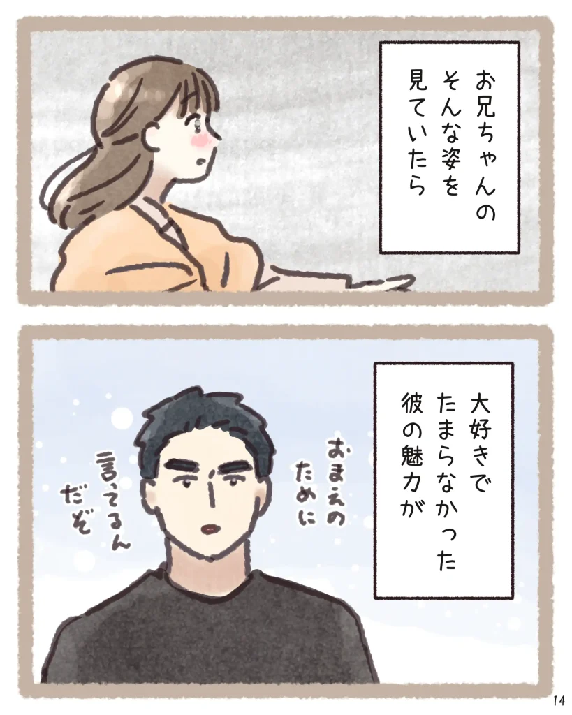 お兄ちゃんのそんな姿を見たら、不思議なほど一瞬で彼への未練が消え失せた、というくだりがすごくリアルで。本当に自分を大事にしてくれる人の存在に気づいた瞬間って、それまで見えなかったものが一気にクリアになるんだなと。