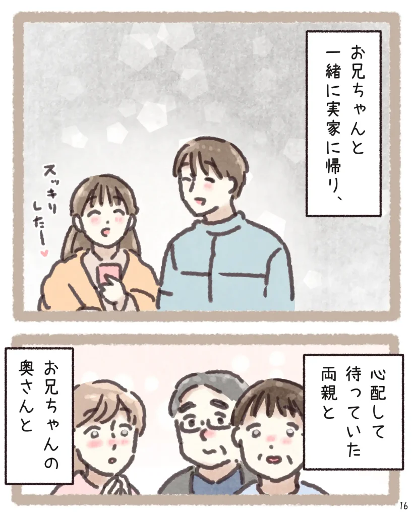 でもこのお話の本当の主役は、7歳年上のお兄ちゃん。実家に電話した妹のために、寒い中を走って迎えに来てくれて、ベンチで話を聞いて、経緯を知ったら呆れながら怒ってくれて。「俺弱いけん負けるかもしれんけど、ぶんなぐってやるけん!」という方言まじりのセリフに、不器用だけどまっすぐな愛情がにじみ出ていて、読んでいて涙が出ました。