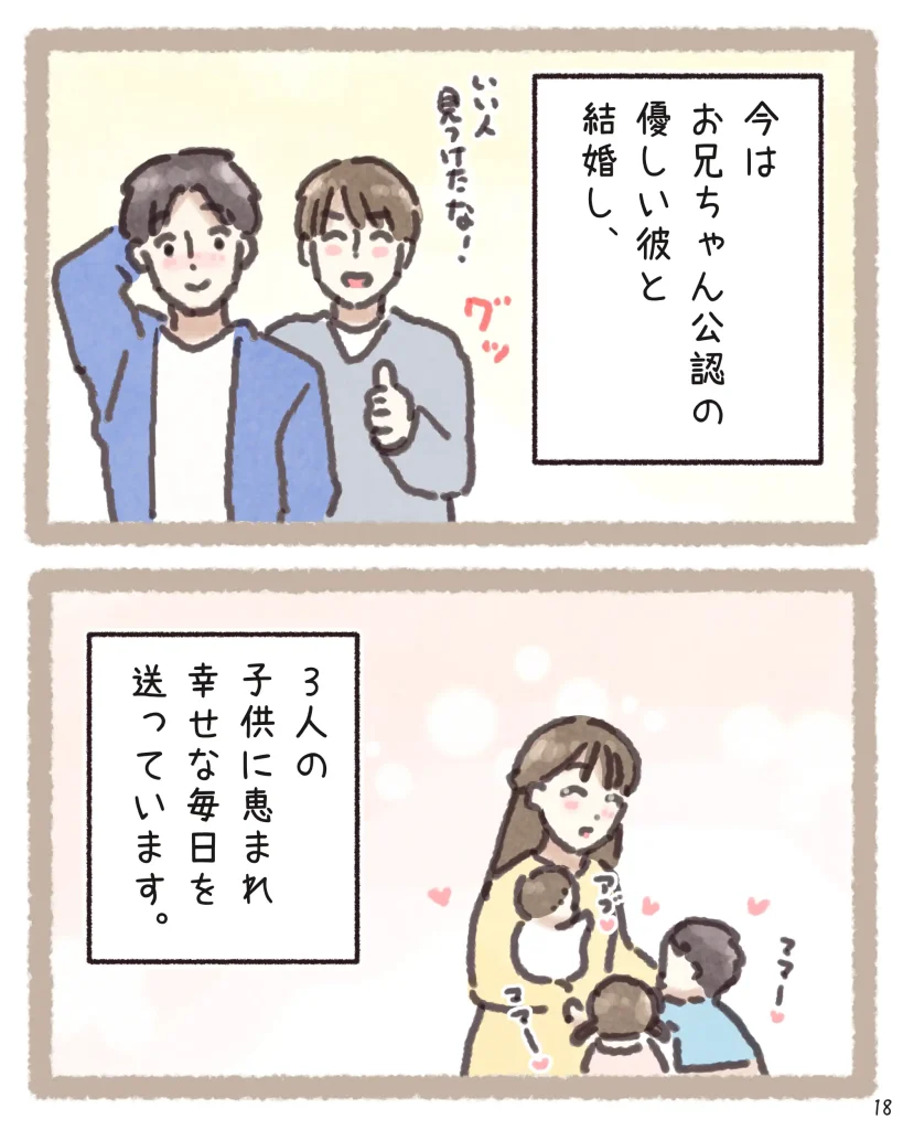 そして今は、お兄ちゃん公認の優しい彼と結婚して、3人のお子さんに恵まれて幸せな毎日を送っているというハッピーエンド。人生のパートナー選びって、自分の将来や家計、子育ての環境すべてに関わる大きな決断ですけど、まりんごさんはちゃんと自分にとって本当に大切なものを見極められたんですね。