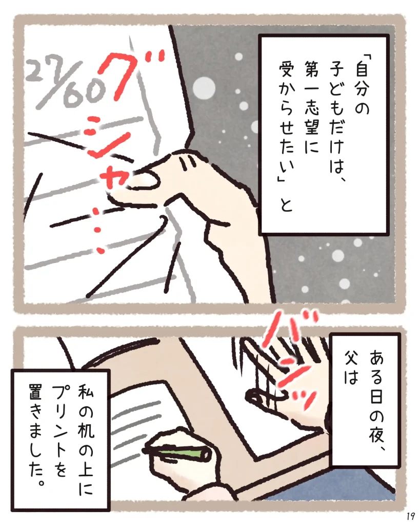 中学受験の学習カリキュラムは小5から一気に内容が高度になると言われていますし、それまで順調だった子が急に壁にぶつかるのは決して珍しいことではないそうです。でも、お父さん自身が中学受験で悔しい経験をしているからこそ、子どもの成績低下に冷静でいられなくなってしまう。その気持ちもわからなくはないけれど、あんずさんの怯えた表情を見ると、親の期待が子どもにとってどれほどの重荷になるのかを考えさせられます。