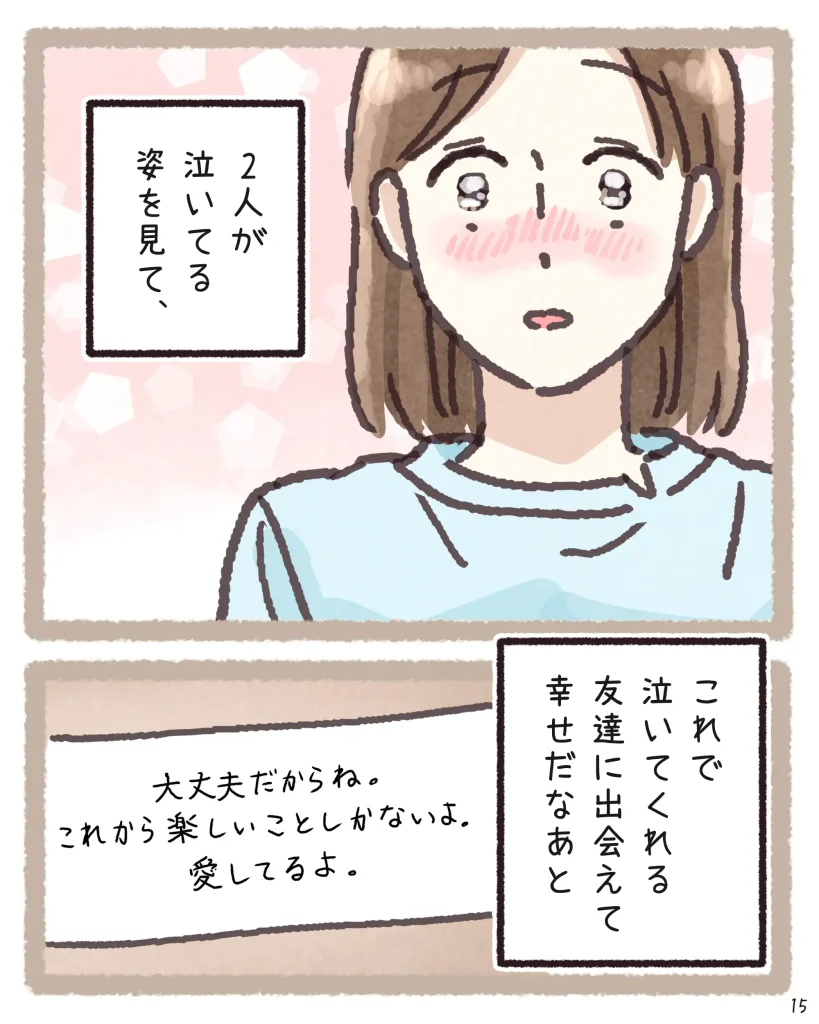 でもユナさん本人は「あっ…これって惚気になっちゃうかな…」と我に返って焦るところが可愛すぎます。確かに「大丈夫だからね」「愛してるよ」という言葉が並んだ手紙を飲み会で見せたら、普通なら「のろけ〜!」ってからかわれるところ。なのに友達2人は、からかうどころかボロボロと泣き出してしまう――この展開に私ももらい泣きしてしまいました。