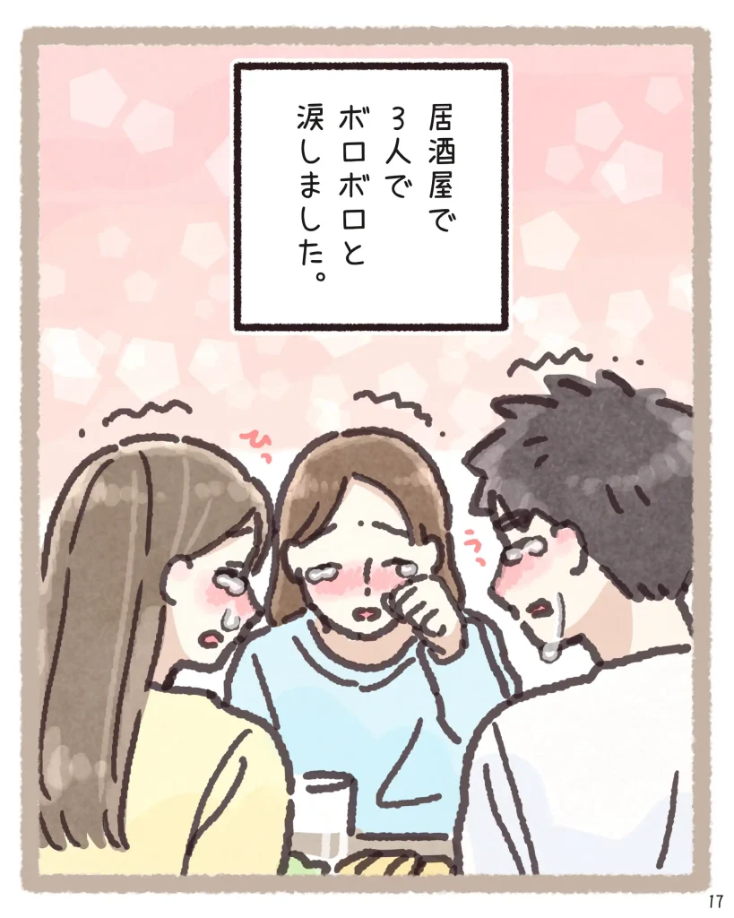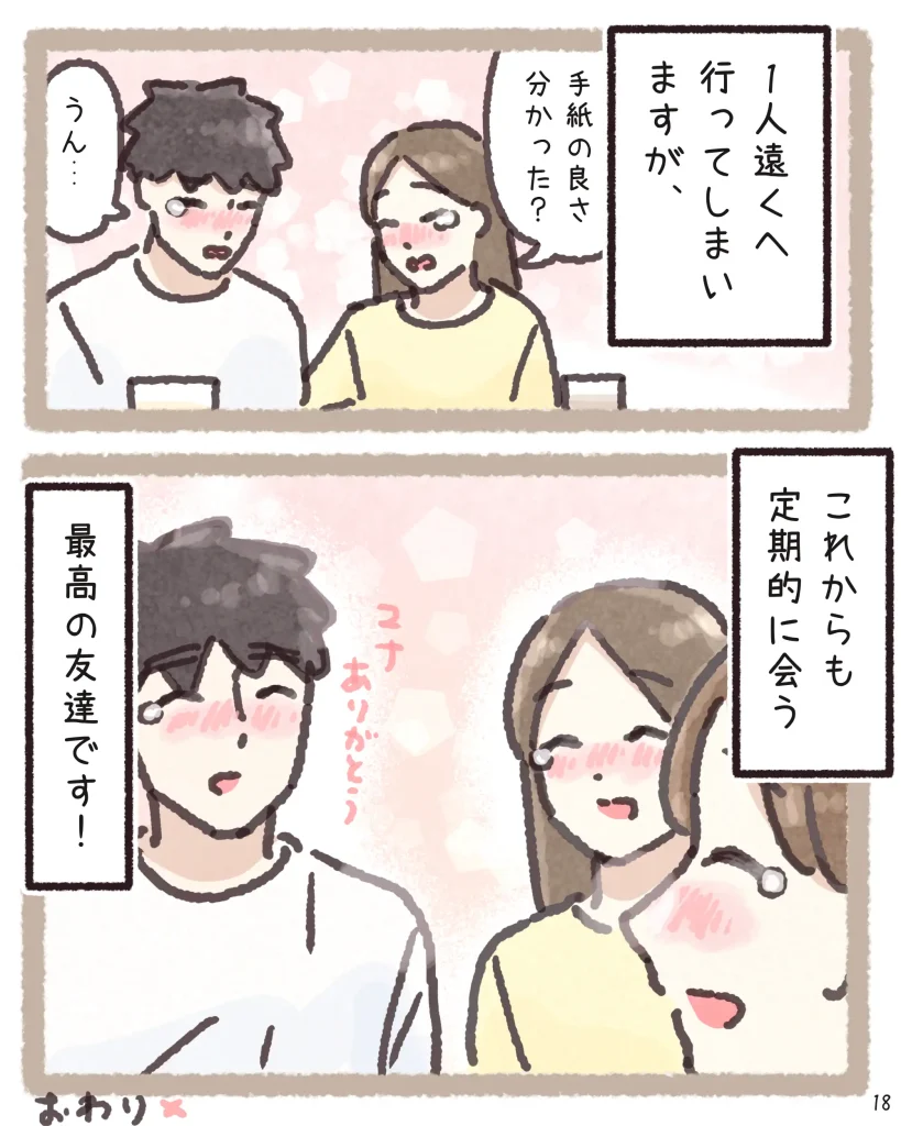 1人が遠方へ行ってしまっても「これからも定期的に会う 最高の友達です!」という締めくくりに、距離が離れても続いていく友情の強さを感じました。大学時代に同じ部活で青春を過ごして、社会人になっても毎月会い続けて、相手の幸せを自分のことのように喜んで泣ける――こんな関係性、誰もが憧れるものだと思います。